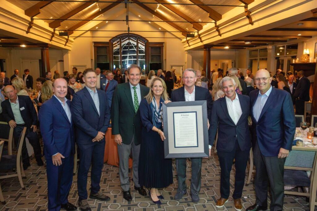 First Tee CEO Greg McLaughlin, legendary quarterback Steve Young, First Tee Honorary Chair Jim Nantz, Pebble Beach co-chairs Heidi Ueberroth, Brian Ferris and Bill Perocchi, and PGA TOUR Commissioner Jay Monahan pose with a declaration celebrating Pebble Beach Company’s support of First Tee.